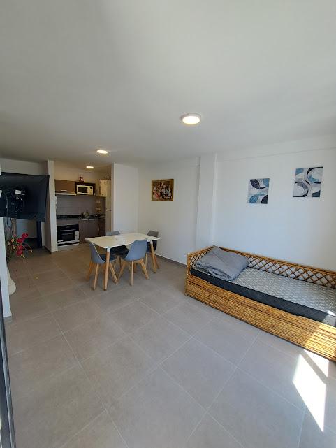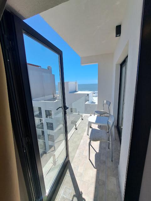 Es un 2 ambientes en contra frente, consta de living comedor y cocina incorporada, ventanal y puerta de vidrio que da al balcón en contra frente con vista al mar, dormitorio matrimonial con placard empotrado y balcón, baño completo y ante baño; aberturas en aluminio negro, termotanque eléctrico anafe eléctrico y horno empotrado. En 7° piso se encuentra la terraza con 2 parrillas con amplia vista al mar en todos sus ángulos.